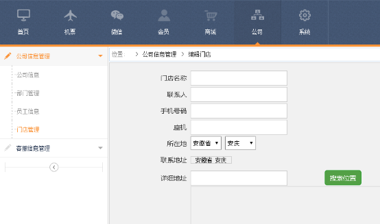 ⑴ 進入微商旅後(hòu)台,點(diǎn)擊“公司”--“公司信息管理”--“門店管理”--“添加”