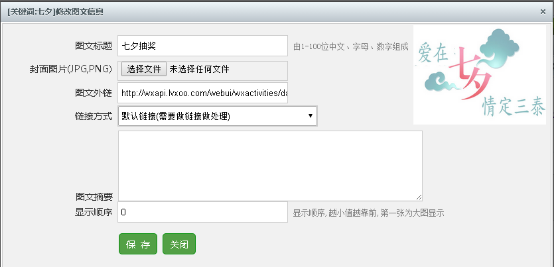 ⑵ 把活動(dòng)(大轉盤(pán)/刮刮卡)鏈接,在微信關鍵詞(cí)管理中設置相應的鏈接(圖文添加),才能使用活動(dòng)生效。